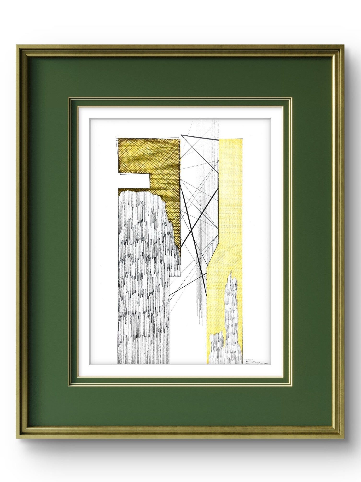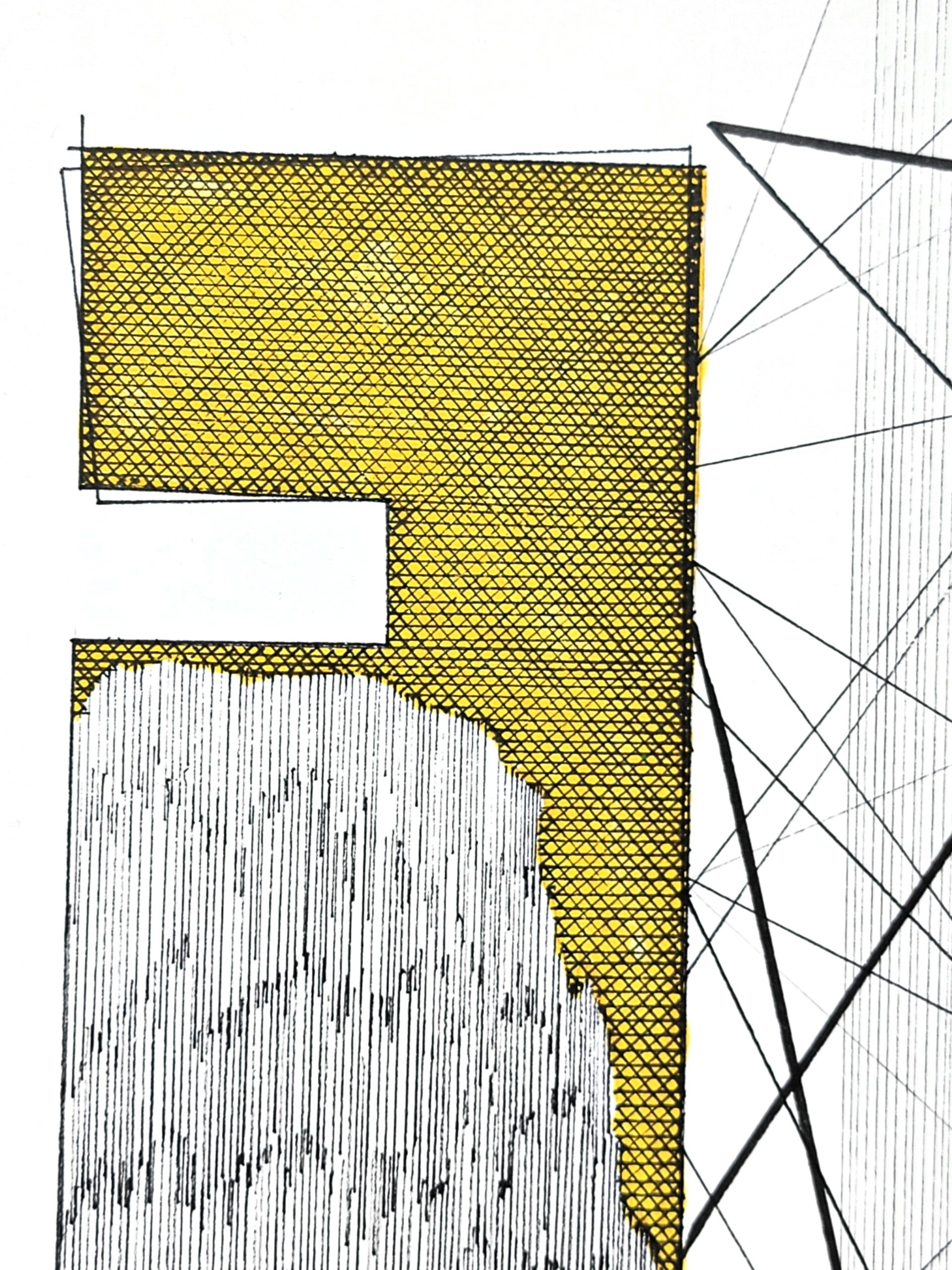 En esta pieza, los bloques de color amarillo capturan la mirada, uno sólido y vibrante, el otro delineado con precisión, creando un patrón de red que juega la percepción de profundidad y forma.