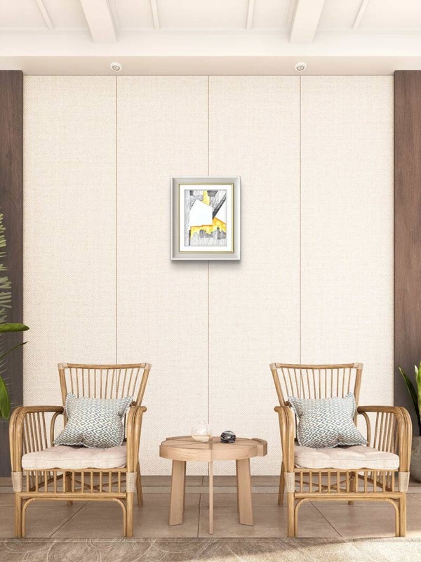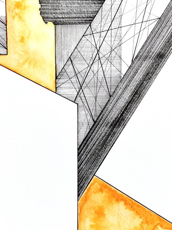 La obra presenta una casa blanca central, rodeada de líneas negras intrincadas y texturas de acuarela en tonos tierra que parecen gotear desde la parte superior e inferior de la forma central. La parte superior de la imagen cuenta con patrones geométricos complejos, mientras que la parte inferior tiene patrones de líneas verticales que recuerdan a una ciudad o estructuras arquitectónicas. El contraste marcado entre las líneas negras detalladas y la fluidez de las acuarelas te invita a una experiencia visual profunda, donde el espejismo de los sueños acaricia la realidad.